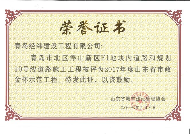 公司長(zhǎng)期以來(lái)堅(jiān)持以人為本,誠(chéng)信經(jīng)營(yíng),客戶(hù)至上、,互利共贏(yíng),奉獻(xiàn)社會(huì),回報(bào)大眾,在青島本地市政企業(yè)中擁有良好的口碑,多次榮獲青島市市政行業(yè)安全文明示范工地以及優(yōu)秀項(xiàng)目經(jīng)理榮譽(yù),為發(fā)展地方城市建設(shè)做出了積極的貢獻(xiàn)。